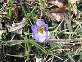 These were the first bees I've seen this year. I don't know what this cute little purple flower is, but spring has sprung, timidly. There were crows, starlings, cardinals, and white throated sparrows in evidence, and then suddenly a dozen fat-bellied robins policing the softening ground. Yes, spring sidles into the borough.